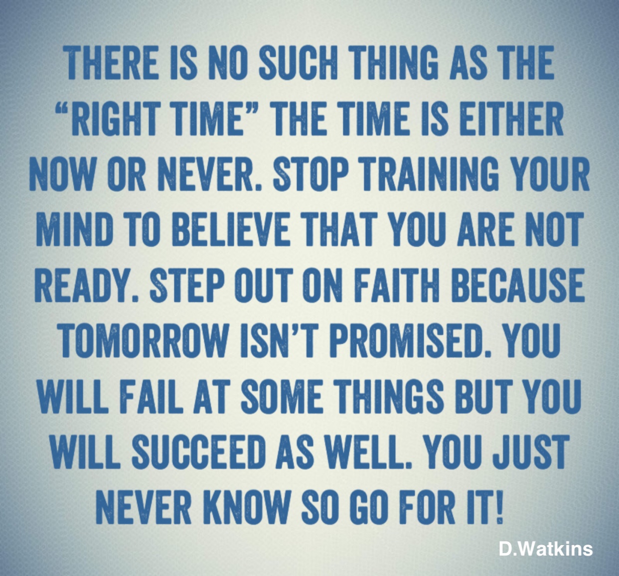 So what’s keeping you from stepping out on faith and going after certain things? Well we’ve all been guilty of saying it before “the timing isn’t right”. So when exactly is the time right? What factors are involved that gives you the comfort of saying ok now is the time?For me I can be quite the procrastinator when it comes to finalizing things and actually making decisions. I find myself pondering on ideas and creating unnecessary stress simply because I put too much emphasis on the different scenarios that can possibly take place. 90 percent of the time I delay a process that ends up being beneficial in the end. Whether I fail or succeed in trying something new there is a lesson to be learned. Trail and error gives us the ability to gain knowledge and have a better understanding for improvement purposes. Life is short. The tomorrow or the next time we so frequently speak of may never arrive. Therefore, the time is of the essence. Make sure you do your research and prepare for the movement you are attempting to make beforehand then go for it. You really do not have anything to lose. The time is NOW